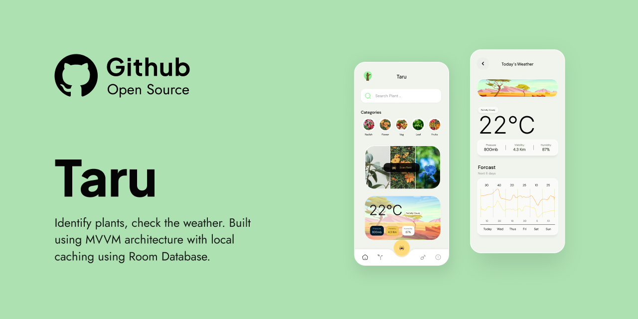 GitHub - nirajprakash/taru-plants-android: Android App for plant lovers! Identify plants, check the weather, and discover new favorites. Built using MVVM architecture with local caching using Room SQLite Database. Taru is completely open source! 🌿